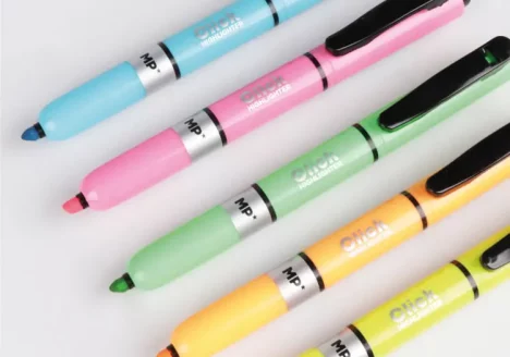 RETRACTABLE FLUORESCENT MARKERS Among the materials that can never be missing in a school or office pencil case are the fluorescent highlighters. They are essential when studying or highlighting any important document. Among our wide variety of highlighters, you will find the Click Highlighter from MP. This is a new, more compact highlighter with retractable… -